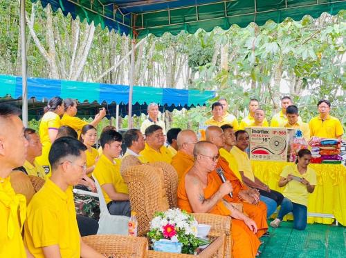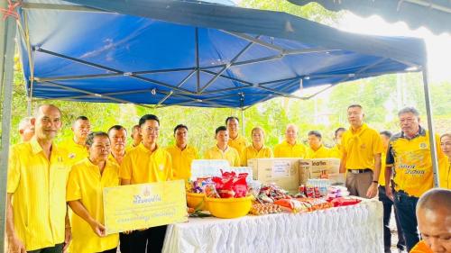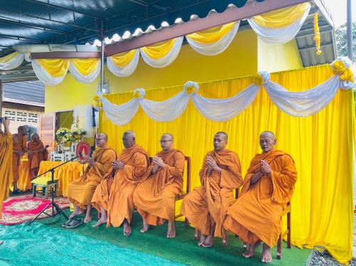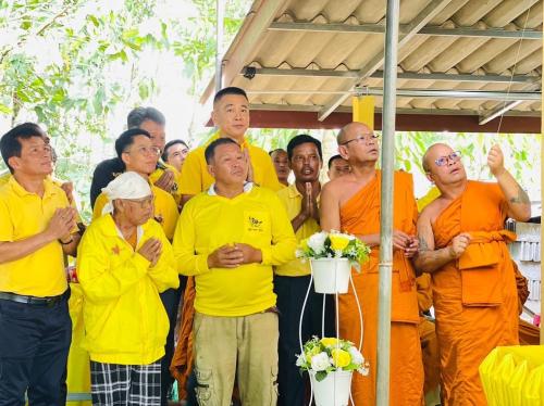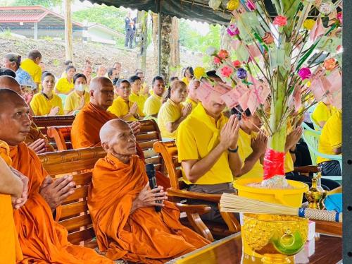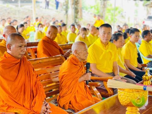 โดยมีคณะสงฆ์อำเภอเขาคิชฌกูฏ หัวหน้าส่วนราชการ ปลัดอำเภอ นายกเทศมนตรี สมาชิกสภาเทศบาล กำนัน ผู้ใหญ่บ้าน แพทย์ประจำตำบล สารวัตรกำนัน ผู้ช่วยผู้ใหญ่บ้าน และ ประชาชนในพื้นที่เข้าร่วมพิธี ในการนี้ ได้ร่วมทอดผ้าป่าสามัคคีเพื่อมอบเงินเป็นขวัญและกำลังใจให้แก่เจ้าของบ้าน พร้อมมอบสิ่งของเครื่องใช้อุปโภค บริโภคด้วย